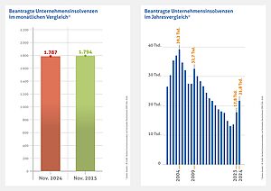 Das Statistische Bundesamt* hat heute die Zahl der Unternehmensinsolvenzen für den Monat November 2025 veröffentlicht. Demnach ist die Zahl der beantragten Unternehmensinsolvenzen im Vergleich zum Vorjahresmonat um 0,4 Prozent gestiegen. Das Leibniz-Institut für Wirtschaftsforschung Halle (IWH) meldet für den Januar 2026 einen Rückgang von 8 Prozent gegenüber dem Vormonat Dezember bei den Insolvenzen von Personen- und Kapitalgesellschaften in Deutschland. Laut Destatis lagen die Forderungen der Gläubiger im November bei 1,5 Milliarden Euro, während sie im November 2024 noch bei 2,8 Milliarden gelegen hatten.